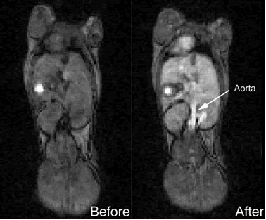 | Luna Innovations has produced and demonstrated a prototype contrast imaging agent designed to be more effective at enhancing images and is potentially safer than current MRI agents. Here, images of a mouse show contrast quality before and 30 minutes after administration with noticeable enhancement. Luna is building a portfolio of nanomedicines aimed at disease targeting and diagnostic imaging based on their new HYDROCHALARONE (TM) family of molecules. |